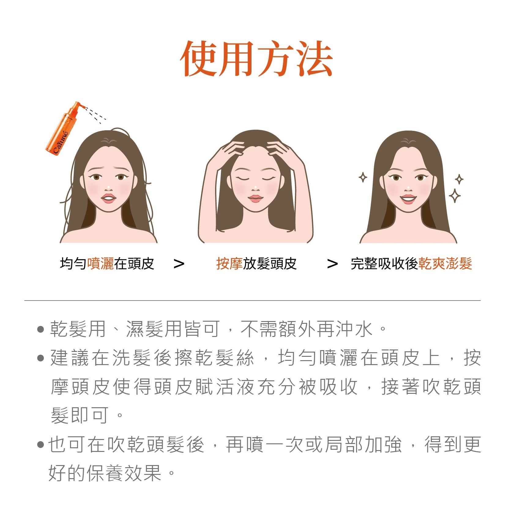 使用方法:使用【卡沐淨衡洗髮、護理】後,擦乾頭髮,接著再使用卡沐淨衡頭皮賦活液噴至頭皮,稍微頭皮按摩即可。